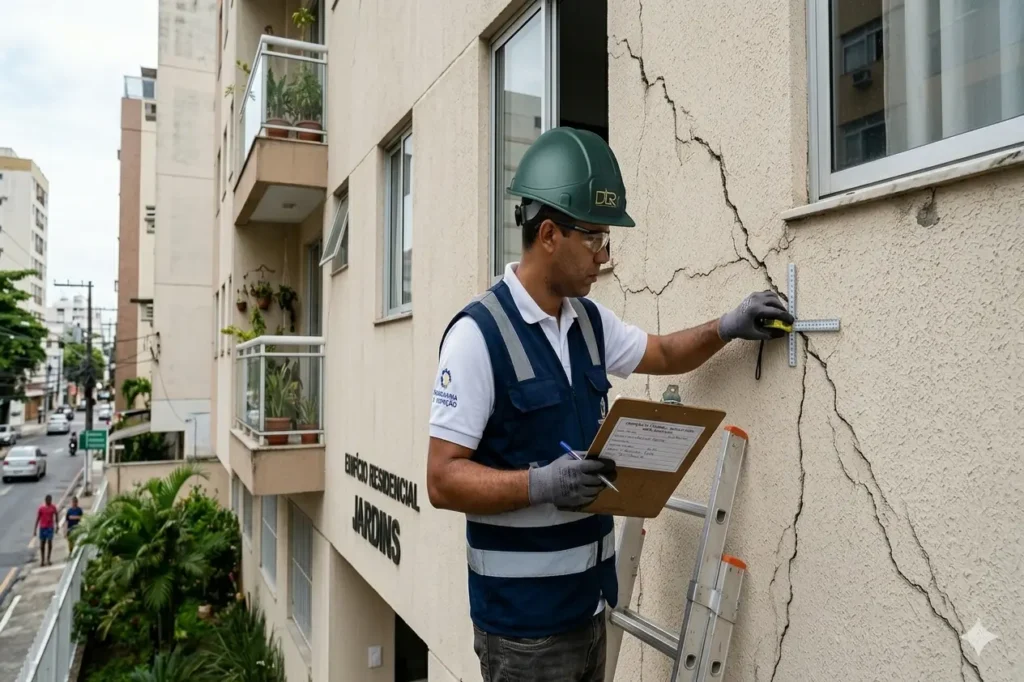Trincas em elementos estruturais, infiltrações persistentes, corrosão de armaduras, recalque de fundação — qualquer suspeita de comprometimento estrutural exige laudo. A responsabilidade civil do síndico está diretamente vinculada à adoção de medidas técnicas documentadas.